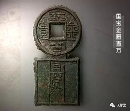 男一号推出过很多精美的钱币,但是有一种却在史书里面找不到任何记载。它造型奇特,上半部分是圆形方孔,写有“国宝金匮”四个字,下半部分是长方形,上书“直万”二字。历史学家根据它的出土情况和铸造风格,认定它是新莽时期的钱币。这就是“国宝金匮直万”。