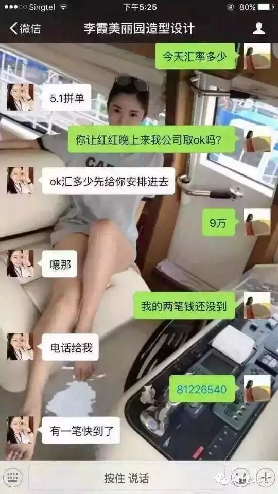 她是中国人,在新加坡经营造型设计店。平时会请她化妆,做造型,美容,租赁演出服等!3年以来一直在帮很多中国在新加坡任职的人们汇款,以30天到账,比当天利率高0.5个点左右的诱惑力让大家纷纷通过她汇款到中国的账号上!