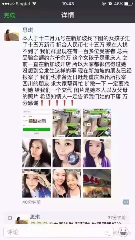 长久以来一直无事,跟着她生意做大,于是汇款的人也越来越多,但是听说这几天跑了..刚听朋友说.卷着四千多万新币跑了!!也就是说2亿人民币,新加坡警方已经立案!