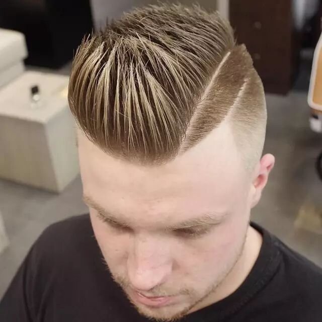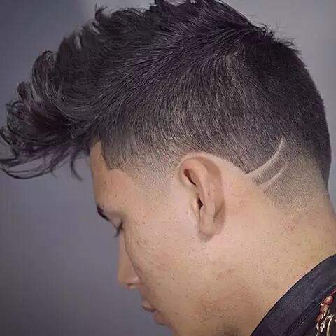 不规则的尖刺型,侧面两道杠的新潮与顶部的尖刺互相呼应,看似不规则的造型其实不要忘了用定型剂,将发蜡涂抹于发根,然后作用与头发上,用手抓出不规则感。