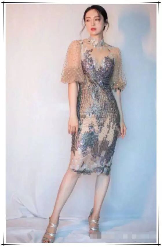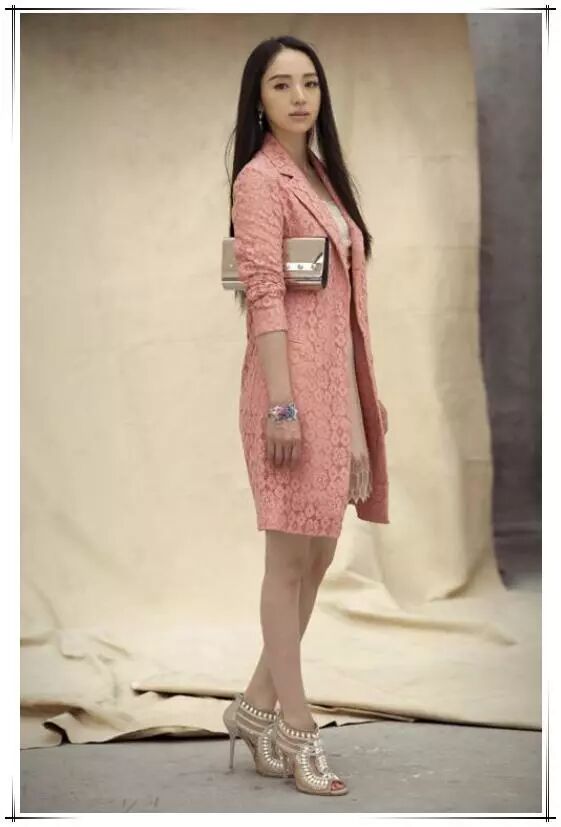 肤色的修身款连衣裙简约优雅,裙边加上蕾丝的拼接更具甜美可爱,搭配粉色的开衫上衣魅力瞬间加分不少,搭配肤色的高跟鞋很时髦呢。但是整体给人一种很老气的feel。