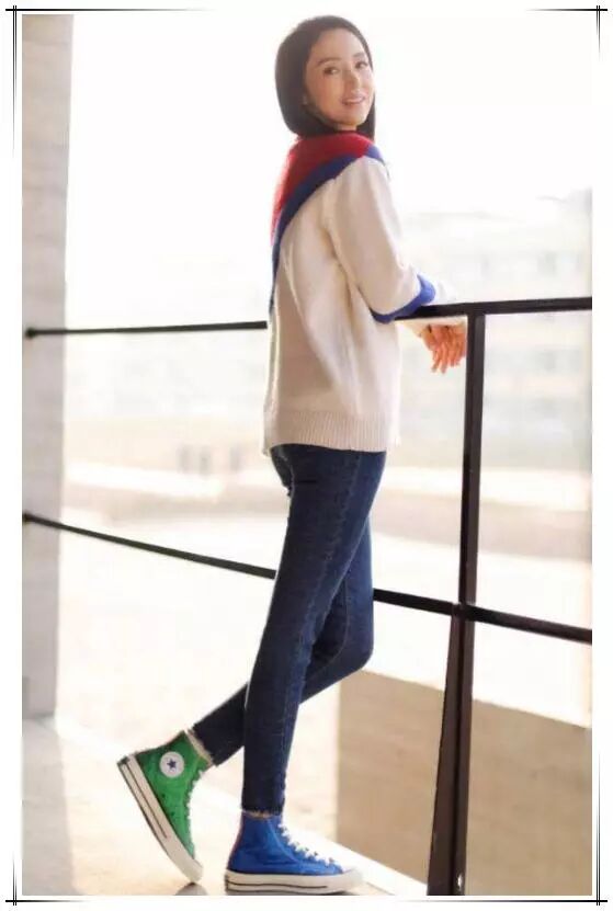 白色的拼接毛衣简约俏皮,很有学院风的情怀,搭配深蓝色的牛仔长裤,尽显美腿呢,绿色和深蓝色撞色的高帮帆布鞋,简直不要太减龄呢。
