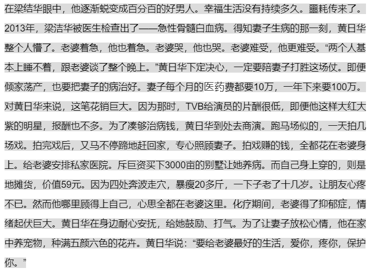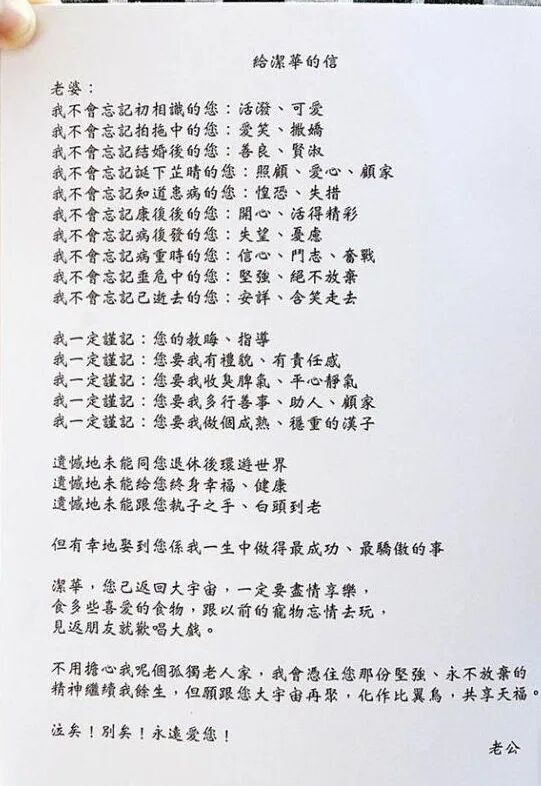 然而2015年,她病情突然复发。黄日华心急如焚。他到处找医院给老婆安排手术。哪怕只有一线希望。他都要拼尽全力。梁洁华接受了骨髓移植手术,手术过程很成功。可惜,因为术后器官衰竭,她永远离开了……她唯一放不下的,是黄日华。临死前,也不忘嘱托女儿:看住你爸爸呀,你爸爸年纪大呀!妻子去世后,黄日华沉浸在悲痛中。出殡那天,他写信深情告别:有幸娶到您,是我一生中做得最成功、最骄傲的事。