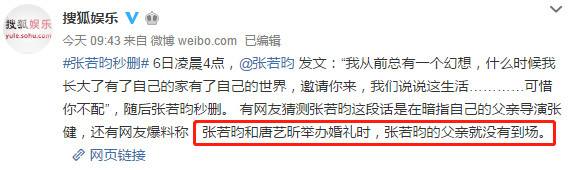 还有人说婚礼当天,张若昀的父亲根本没有到场。