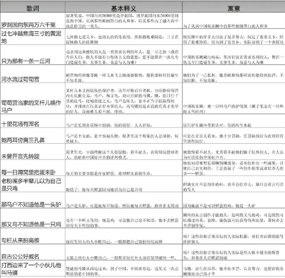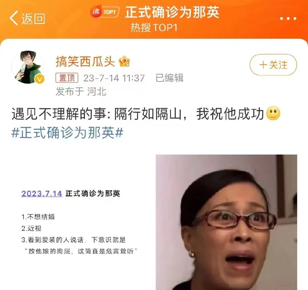 400w人逼那英道歉,内娱最大笑话 LadyDaily 内地女星 2023-07-28 22:00:13 86 创作不易,用心坚持,欢迎请BaGua喝几杯爱心咖啡!打赏并支持本文 打赏并删除本文 那英怎么也没想到。刀郎发首歌,能让她打破抖音评论量最高记录。大概一个多星期前,刀郎时隔十余年带着新专辑回归。这放在内娱本是稀松平常的事情,结果没想到其中一首歌《罗刹海市》,隔天的功夫就被解读为讽刺娱乐圈怪相。而其中的歌词,就是在diss那英、杨坤、汪峰和高晓松。霎那间引发全网解读,个个都拿出一副高考做阅读理解的架势,逐字分析、逐句排查。引得聊斋学家都来跟风凑热闹。甚至还有国外的博主高呼:“完全是为我们德国创作的”说到底,《罗刹海市》本就是讲的一个叫马骥的美少年误入罗刹国的奇幻故事,用来讽刺现实的。但歌一发布,那英成了娱乐圈最大恶人,最新视频下的评论高达400多万条。什么概念哎。势头比肩顶流的大勋花评论也将将16w条。01这里免不了说一嘴前情提要,一个不冷不热的温知识:20年前刀郎横空出世,发布了人生第一张专辑《2002年的第一场雪》。没有宣传,没有打榜,彩铃时代正儿八经投出的民选偶像,销量咔咔270万张,而盗版销量据说更夸张。2004年,要知道当时周杰伦的《七里香》销量才32万张。一时间传遍大街小巷,人人都会来两句。对当时的自诩正统学院派的音乐人来说,这无疑是重磅一击。音乐风云榜2010年评选乐坛10年十大影响力歌手,那英是评委会主席,在评选时她对刀郎入选存有异议:“他不具备审美观点。”不认可他音乐的审美是真的,承认他销量的合理性也是真的,最后依旧维持自己观点:不能光看销量。汪峰说:“刀郎现象是流行音乐悲哀的表现”。杨坤点评:“这些歌是没有品质的,是让中国流行音乐倒退了15年”。恰巧这三位都成了《中国好声音》的导师,有人说他们联手打压,以至于刀郎被迫退出乐坛20多年。贵圈排挤早不是什么新鲜事,在他们看来,歌词里的“未曾开言先转腚”只是更加坐实了这几位消灭异己的罪证。甚至博主将《罗刹海市》的部分音源转成女音,画面上还配了头号反派那英的老冤家田震。单单那英成为靶子被冲到破记录,其实也不奇怪。02 你懂。英子不是第一次因为说话而站在风口浪尖。刚开通微博之时,就兴奋地呼朋唤友:死三八!我,老那!我也博啦!加我不?后来那英出新歌,粉丝号召打榜,那英直接在下面评论:“姐不需要。”记者问如何看待章子怡当选秀评委,姐站当事人前边旁边扯着嗓子:“隔行如隔山,这很难评,我祝他成功吧。”还不嫌事大立马补充“我也不知道为什么找她,可能是在造型上起到一个作用。”以及那些广为流传的名梗春晚的时候,央视记者问那英你演唱《丝路》应该也有所了解对吧。英子:我不了解。她一直这样,脑子赶不上嘴巴,说的话干的事总透着一股直楞劲。只要在她的认知里是对的,那绝不含糊。甭管被骂被嘲,那不在她的考量范围内。后来,自己终于意识到说话不动脑子太伤人,开始有意克制自己。心里话一秃噜出来,立马紧急找补。但即便慢慢收敛起来,英子依旧是英子,参加一个节目爆一个热点,给这一届网友的震撼那是一点没少。在萌探,孙红雷问黄子韬为什么没有女朋友,他戴个墨镜悠悠然:“没遇上喜欢的”。那英走到他面前一拍桌子,你太拿自己当回事了!语毕,双手背后悠闲离去。参加浪姐2的时候,张柏芝演唱《星语心愿》后感动得流下眼泪,那英一边拥抱安慰着,一边嘴上说:“没事,你别哭,我都没投你票。”成团夜刚开始还挺官方:“成团只是为了要证明自己,有能力去跟自己挑战。其实我们成团,就是为了有更多的能量,给更多的姐姐看到,我们是可以的。”话锋一转,根本憋不住的大实话:“虽然说,成了团也没什么用……”兴奋起来,连何炅都救不了场。《声生不息》里张韶涵和那英比赛,前者输后非常不满,半开玩笑道“我这还输了,输了就算了,还给我这个分数,什么38!”结果英子听到这句话远远跑来,操着东北口音喊“你们就该输!”旁边目睹整段的华晨宇震惊困惑,问那英:你在歌坛怎么存活下来的。他当然不理解,英子全靠唱功啊。03也是因为那英口无遮拦的作风,网友更加确信她亲口说过“听刀郎的歌的人都是农民”。即使没有影像记录,也没有文字报道。其实当时也有不嫌事大的记者当面拱火刀郎。而他本人直接反问记者“你亲口听过那英说过吗?”。最后来了一句,既是否认也是澄清道“那就是空穴来风嘛”。说真的,前段时间还在造神高呼“质疑那英 理解那英 成为那英”。那英曾经发过的疯,都成了当代人的精神状态。那英骂过的话,都被看成超前语录。Cr.见水印将几年前的话倒腾出来,剪辑成了各种短视频段子风靡全网无孔不入。其中有些越品越咂摸出味,这不就是我的嘴替吗?!Cr.见水印每逢放假调休的时候,又把那英重要讲话搬出来。暑期档铺天盖地的油,还得靠英 · 洗洁精· 子这张嘴。Cr.见水印20多年前的剧翻箱倒柜重温后,大批网友正式确诊为那英。直到刀郎发布新歌。在一轮又一轮解读后,歌词最根本的含义反而被掩盖,矛头从事转人。那英风评急转直下,新一轮灭神活动正式开启。往日的嘴替成了嘴硬,一下子干净划分成了对立方。另一方自然是以刀郎为代表的没势力没背景的广大群众。在这个语境中,那英还未必是那英,只是应网友呼声而立起的互联网人