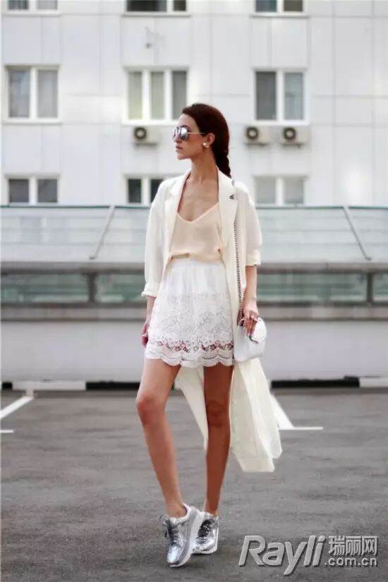 可不是只有运动服能穿运动鞋,蕾丝裙,薄纱外套搭配运动鞋都能拗出很棒的造型!不过选择运动鞋时要尽量选择浅色系。