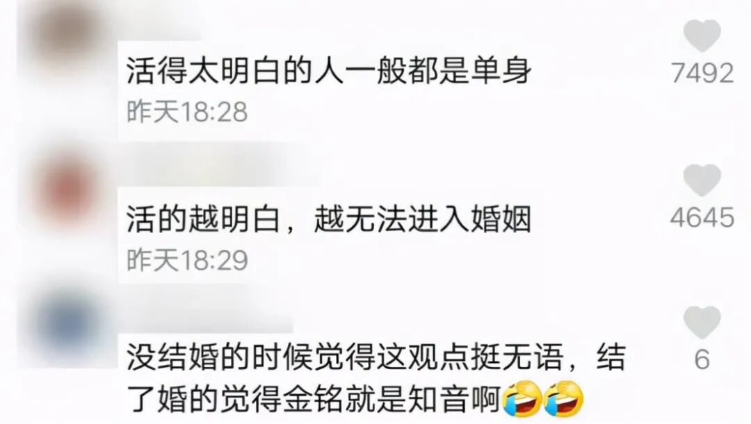 这条视频一经发出,很快引起了网友们的关注。网友们都对金铭的观点表示了赞同,直言“活得太明白的人一般都是单身”,还有一些已婚的观众在评论区感叹道,“没结婚的时候觉得这观点挺无语,结了婚后觉得金铭是知音啊”。