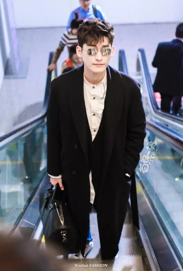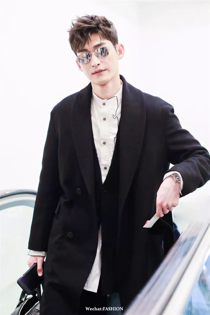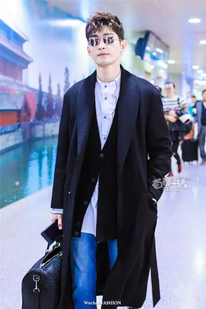 张翰亮相机场,黑色开衫叠穿长大衣,内搭木耳边衬衫,层次丰富,利落帅气。