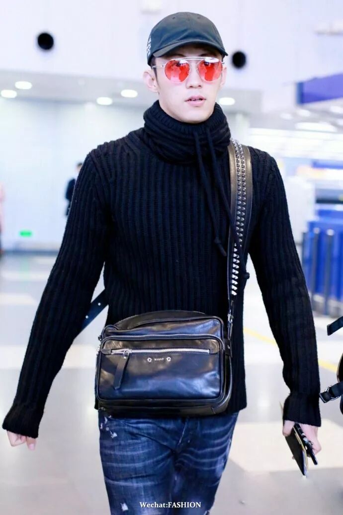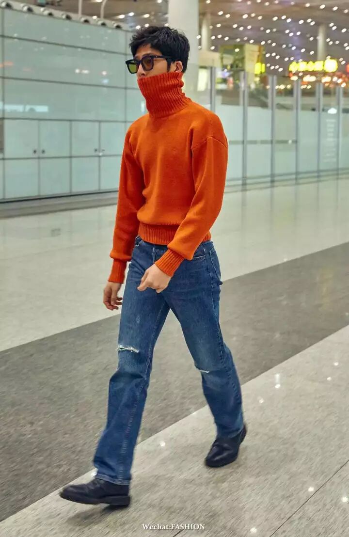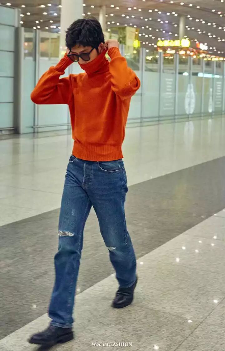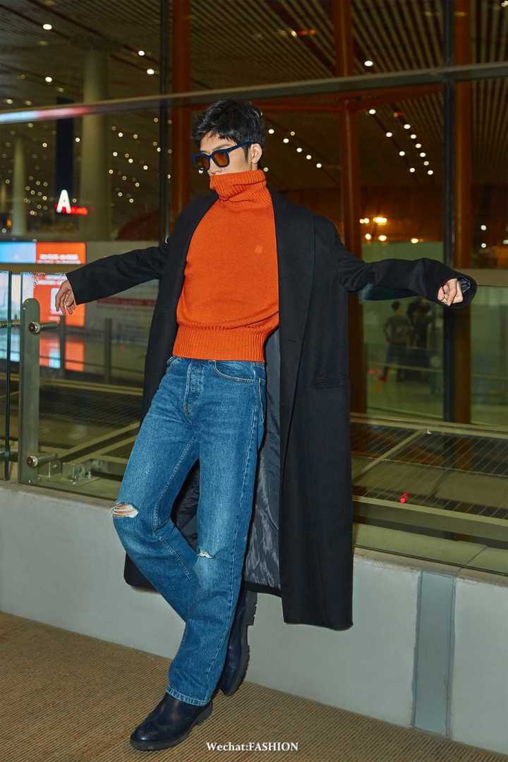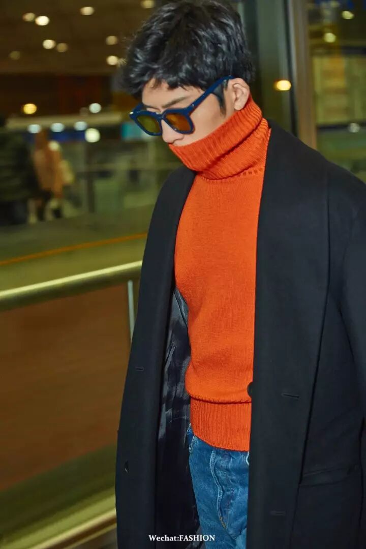 井柏然最新机场look演绎冬日活力穿搭,身着LOEWE印花系列橘色毛衣+WOOYOUNGMI2017新款黑色大衣,脚蹬TOD'S黑色马丁靴,延续井柏然随性简约风,帅气又撩人。