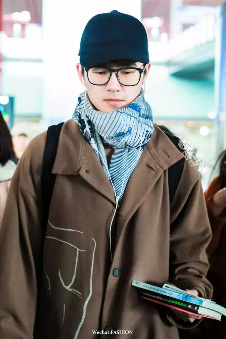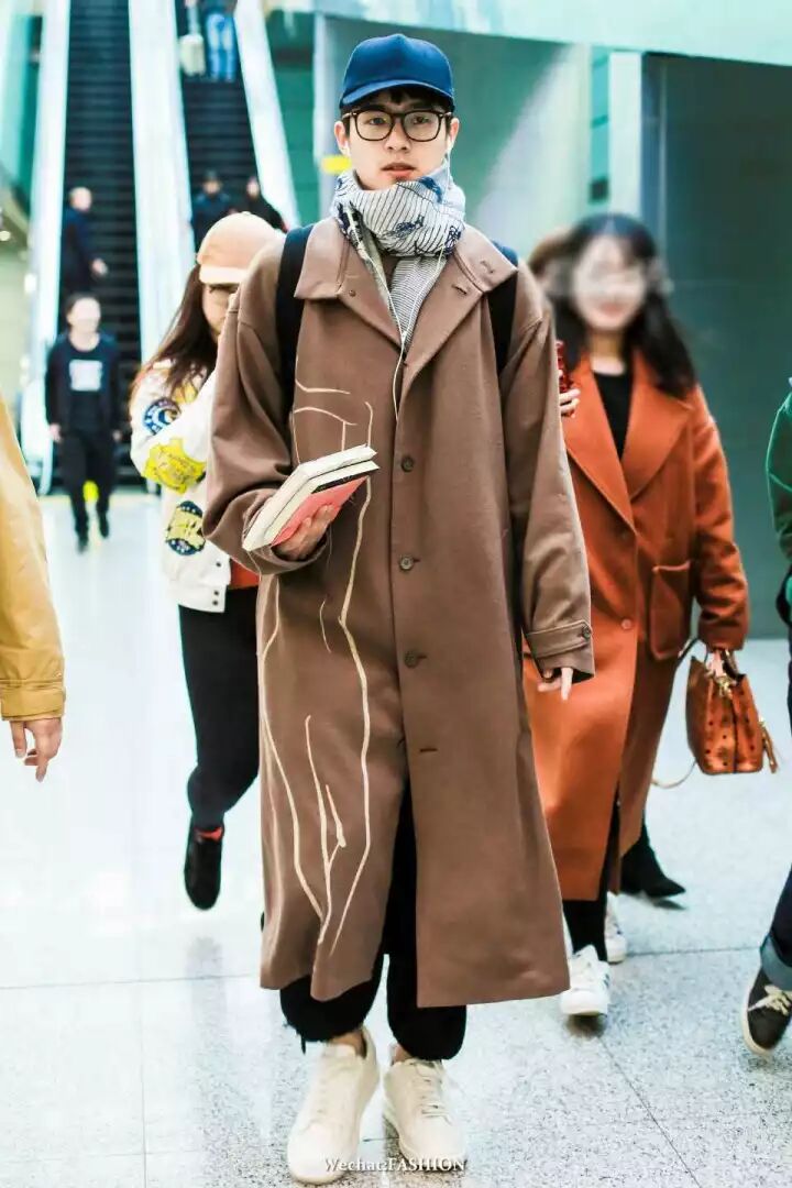 刘昊然用驼色超长款大衣搭围巾,头戴蓝色鸭舌帽,时髦又有型。