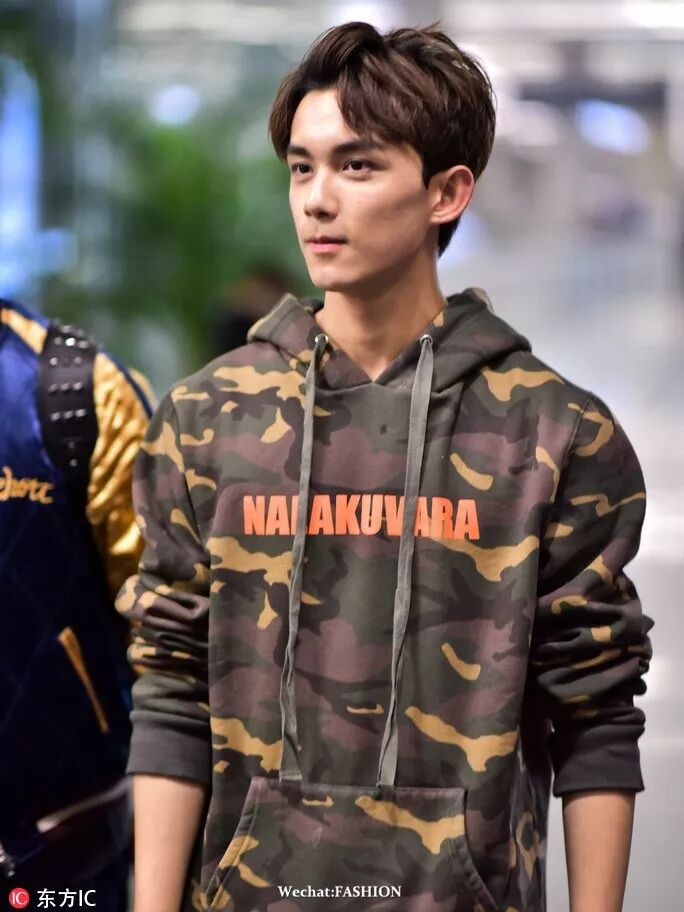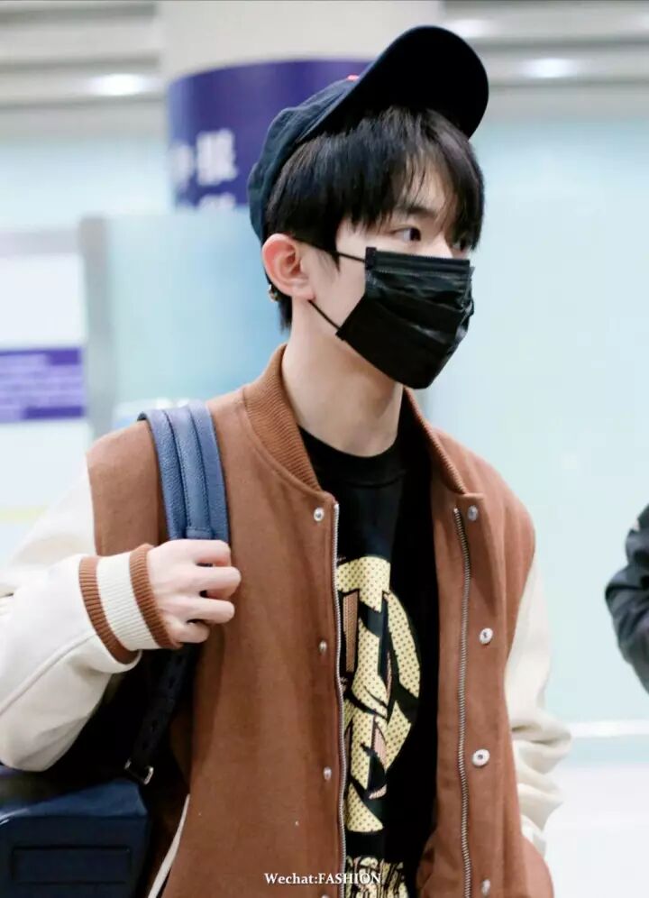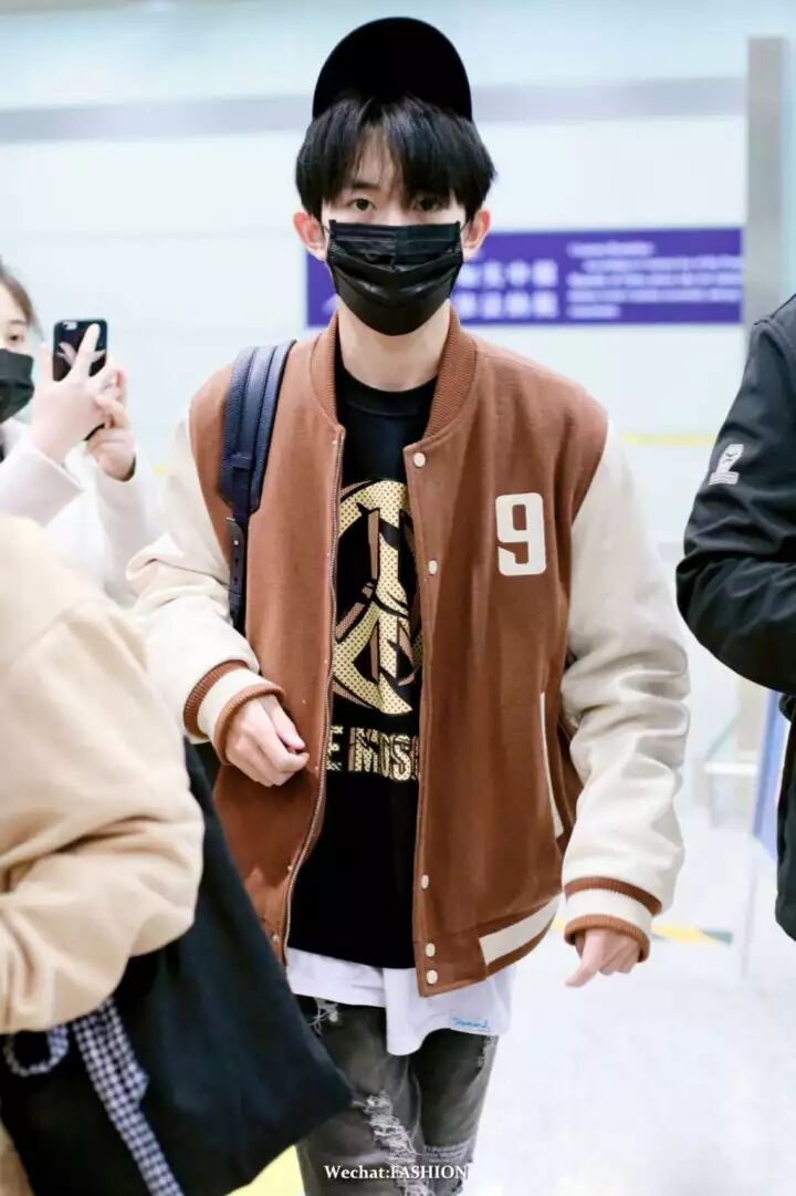易烊千玺现身机场,白T恤叠穿印花卫衣,外搭飞行员夹克。