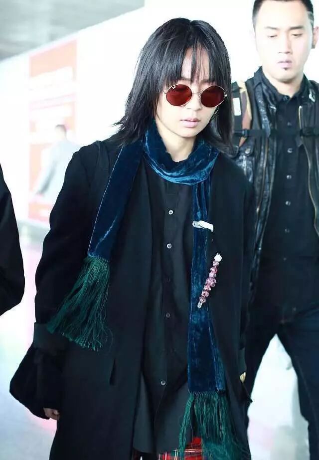 一件黑色长大衣,搭配了一个金丝绒质的围巾,头发散乱,没有做造型,看上去稍微有一点憔悴,紧贴头皮的发型也显得脸有一点大。
