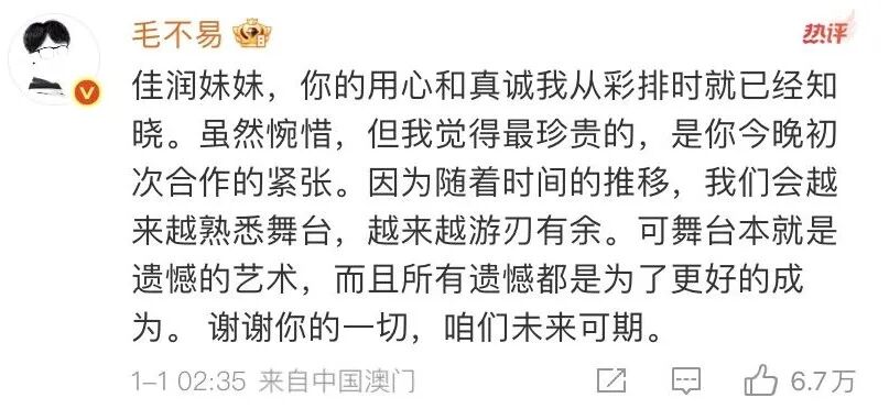 “佳润妹妹,你的用心和真诚我从彩排时就已经知晓。虽然惋惜,但我觉得最珍贵的,是你今晚初次合作的紧张。因为随着时间的推移,我们会越来越熟悉舞台,越来越游刃有余。可舞台本就是遗憾的艺术,而且所有遗憾都是为了更好的成为。谢谢你的一切,咱们未来可期。”