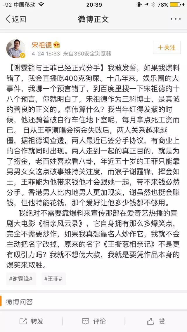 前些日子沉寂很久的大嘴宋祖德突然爆料称:王菲和谢霆锋已经协议分手!而且宋祖德承诺如果消息不准确自己会直播吃400g的翔!此消息一出,网上评论一下就炸裂了,可谓轰动娱乐圈。