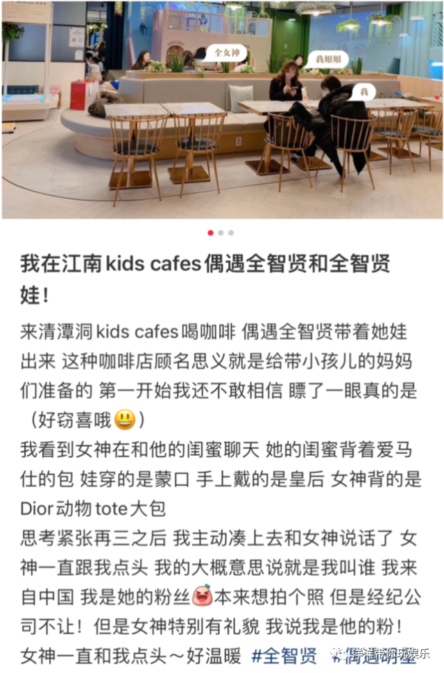 3月22日,有网友分享动态直言偶遇全智贤带她的娃出来喝咖啡,因为全智贤带着俩儿子,所以精心选了一家专门给带小孩妈妈准备的咖啡店,与全智贤一起的还有闺蜜以及经纪人,因为女神的高颜值,很快就将周围喝咖啡的路人吸引,这位网友还专门打量了全智贤及孩子,一家人都身穿名牌,儿子更是手戴名贵手表,从小就被全智贤富养。