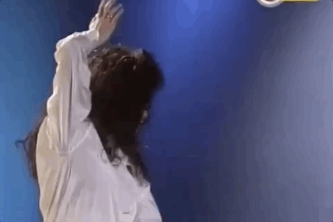 ▲ 《无言歌》的MV后半段,忆莲倒挂起舞的镜头,力量感与柔韧性都相当震撼,而当年她已经46岁了。