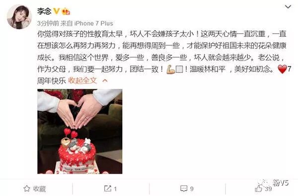 李念还写道:“你觉得对孩子的性教育太早,坏人不会嫌孩子太小!这两天心情一直沉重,一直在想该怎么再努力再努力,能再想得周到一些,才能保护好祖国未来的花朵健康成长。我相信这个世界,爱多一些,善良多一些,坏人就会越来越少。老公说,作为父母,我们要一起努力,团结一致!温暖林和平,美好如初念。7周年快乐。”