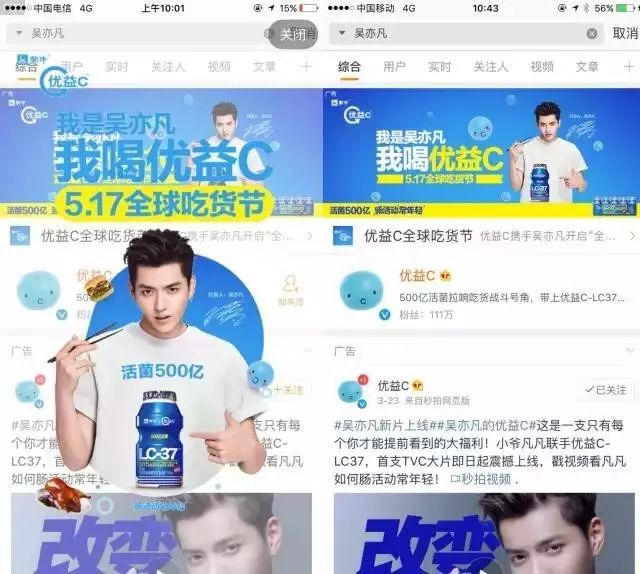 吃货节期间,优益C还在新浪微博搜索“吴亦凡”页面埋入了惊喜彩蛋,搜索即有吴亦凡页面跳出,将代言人和优益C再次进行强势关联。