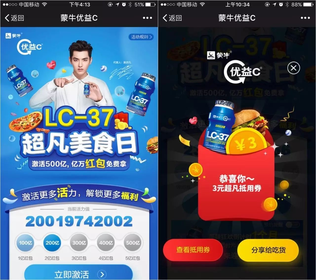 在吃货节之前,优益C推出了新产品优益C-LC37,明确了37°环境强活性、500亿活菌、丹麦菌种三大利益点,并进行了充分的消费者教育。吃货节前一个月的4月17日,优益C就和大众点评网合作,上线 “LC-37超凡美食日-激活500亿”互动活动,网友在大众点评的每一次登陆、消费都会在奖池中累积活力值,每达到100亿活力值就超级放送1亿现金红包福利,供所有吃货共同享用。