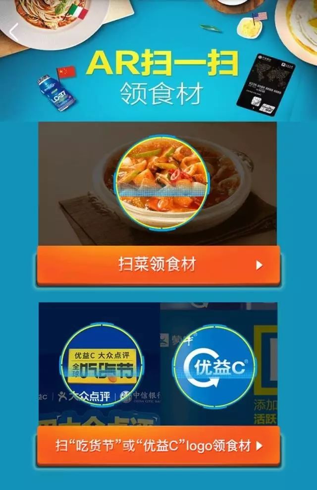 在吃货节上,优益C联合大众点评,利用LBS+AR扫码功能首次引入了免费菜概念,用户通过线上游戏、LBS商户签到、AR扫描优益C logo和食材等途径收集虚拟食材,收集完成后,即有机会免费吃爆款菜品,并有千万份霸王餐可供换取;除此之外,集食材活动还特意增添了具有极强社交属性的“偷食材功能”,让万千吃货直呼过瘾,根本停不下来。