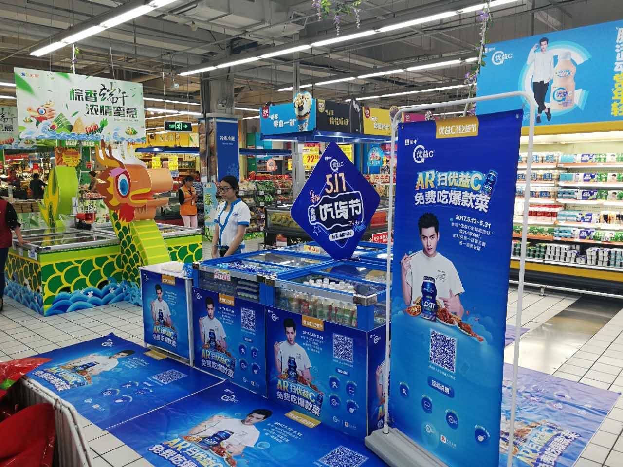 5月17日当天,优益C和全国37所城市近2000个商超渠道充分联动,与消费者在线下商超场景进行了趣味互动并引导领取免费菜品,助力消费者们放肆吃喝。不仅如此,优益C还霸气承包了全国多地的楼宇LCD屏幕,循环播报优益C全球吃货节活动。