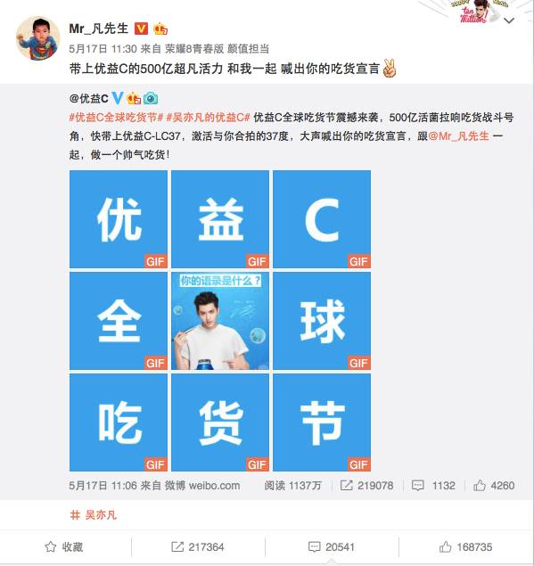 优益C微博的精彩内容也引来了代言人吴亦凡的关注,吴亦凡转发优益C官微并号召粉丝“带上优益C的500亿超凡活力,和我一起,喊出你的吃货宣言”。吴亦凡的助力引发1000万粉丝强势围观。