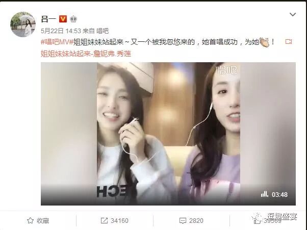 吕一在微博发出和唐嫣一起唱“姐姐妹妹站起来”的视频!还称唐嫣是“又一个被我忽悠来的,首唱成功,为她鼓掌”