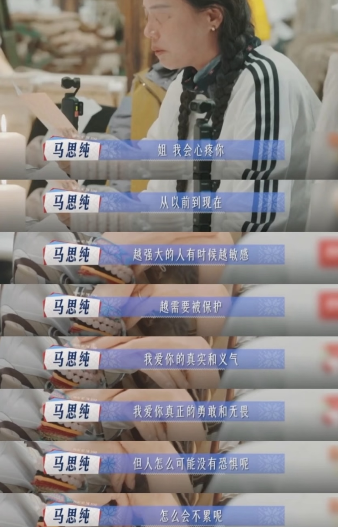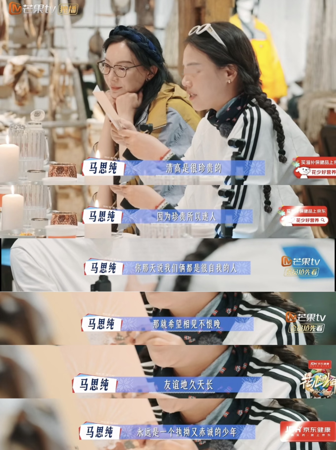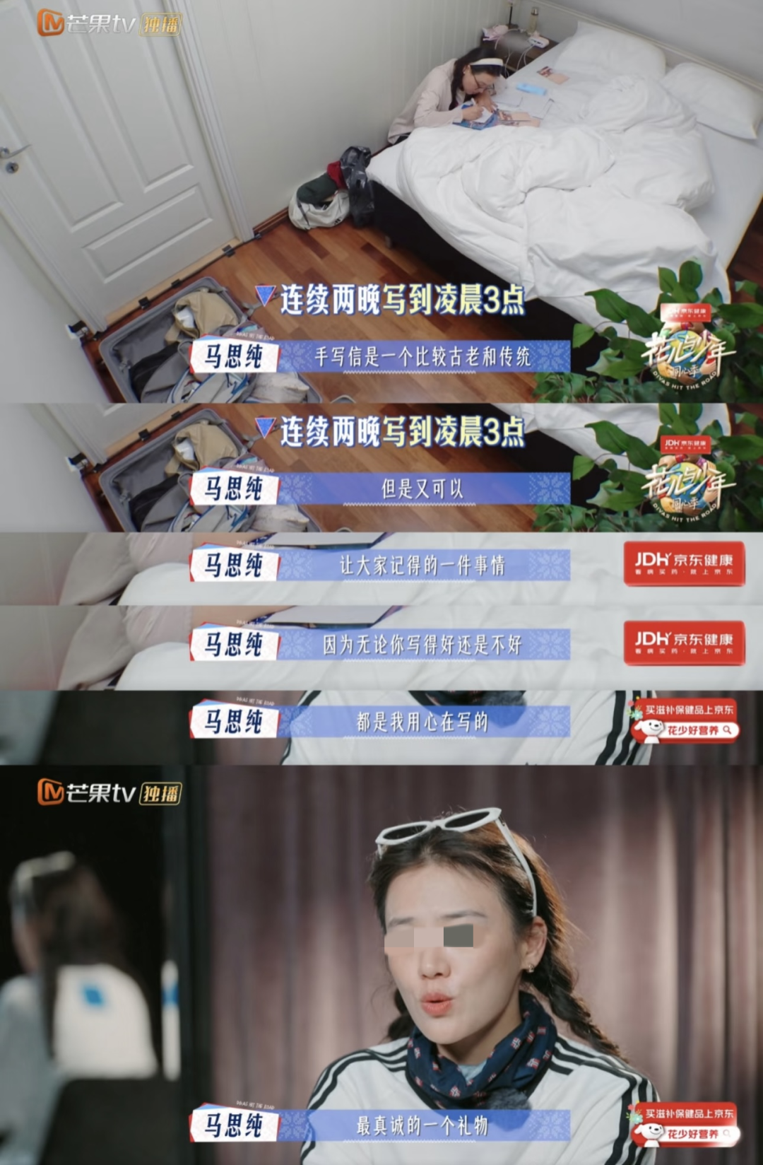 像我第一次看王思聪说“在输想你的液”时一样,心里涌起的倒还不是嘲笑或者讽刺,是实打实有点羡慕。这个年纪还是能有这种心态,说明什么?说明生活的苦他们俩是一口都没吃过。节目的结尾,马思纯给每个人手写信,还是青春疼痛文学的笔触,来描摹她眼中的众人。写得如何见仁见智,但那英说她是文艺青年,心情估计是跟我差不多的。