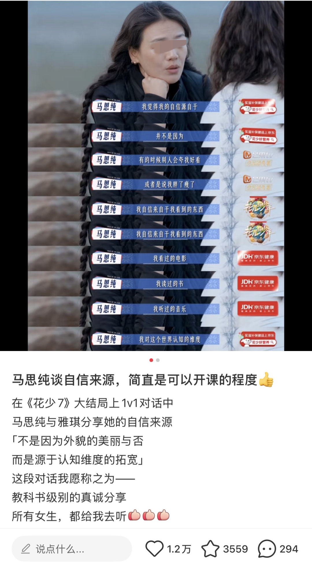 小红书首页飘着万赞的帖子,点进去一看,是马思纯女士在大发感慨,表达如今的自己是多么自信:“我觉得我的自信并不是来源于别人夸我好看,或者说我胖了或瘦了。我自信来源于我看到的东西,我看过的电影,我读过的书,我听过的音乐,我对这个世界认知的维度。或者是我对世界的好奇心,我的自信随着我恢复了对世界的热爱而与日俱增。”帖子的标题是:《马思纯谈自信来源,是可以开课的程度》。