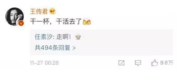 而在微博下方,演员王传君给她评论:“干一杯,干活去了。”