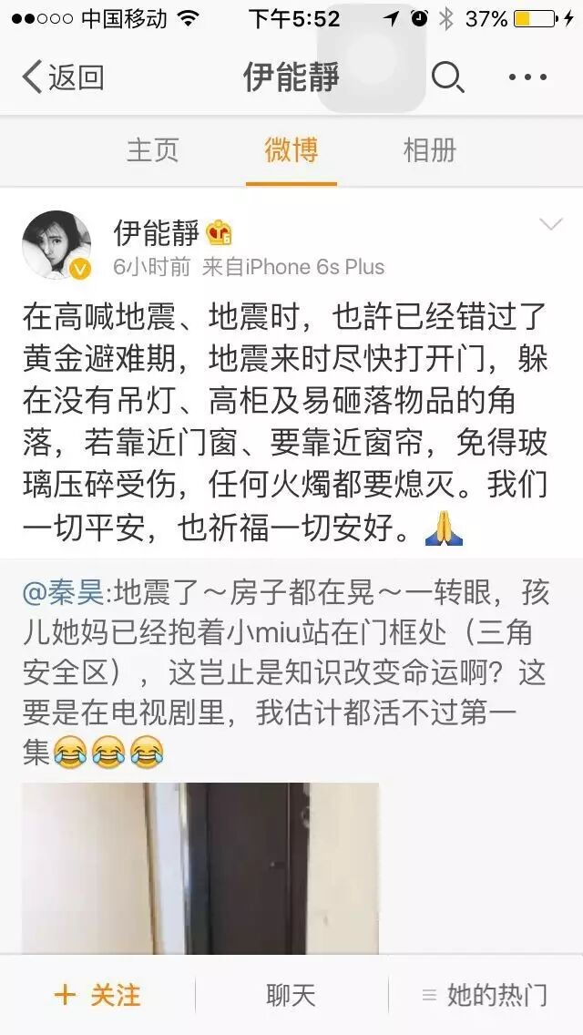 随后,伊能静也转发了秦昊的微博,同时与大家分享了地震避难常识: