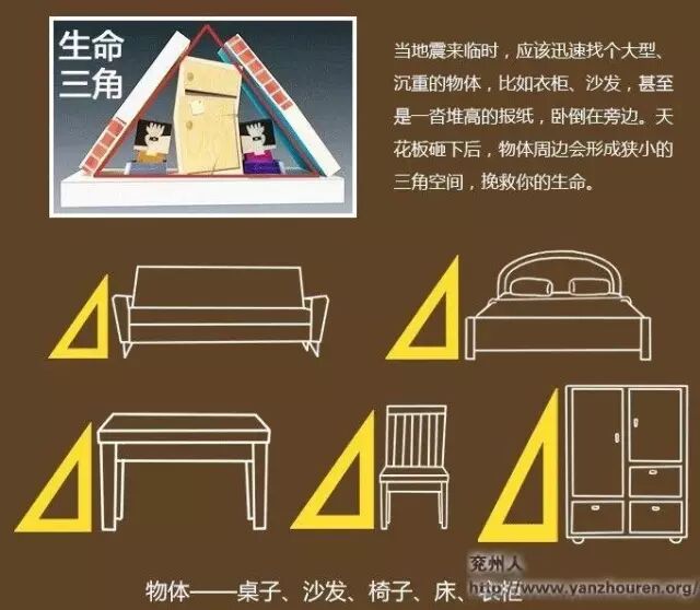 事实上,业界比较认同的自救措施是:伏地、遮挡、手抓牢。所以,地震来临时,要赶紧钻到桌子下边或用靠垫捂住最脆弱的头部,或牢牢抓住桌子腿并做好桌子大幅度移动的准备。这种避难措施更为可靠。(资料来自新华网)