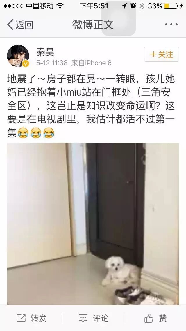 孕妇伊能静在危急时刻,不忘狗狗小miu,抱着它站在门框处躲避。秦昊发微博赞孩子妈知识丰富懂地震求生。