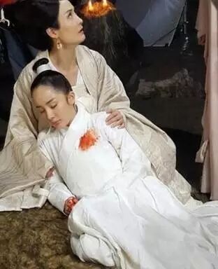 近日,网上流出杨幂在某电视剧中的剧照。照片中,杨幂身穿白衣,梳着包头,左胸上带血倒卧在女演员怀中,网友纷纷回应“粗看像秃头大爷!”、“头套再低点就好了”、“得罪谁也不能得罪造型师!”