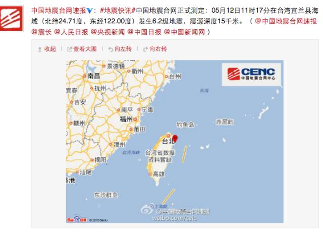 5月12日(今天)11时17分,台湾宜兰县海域发生了6.2级地震。