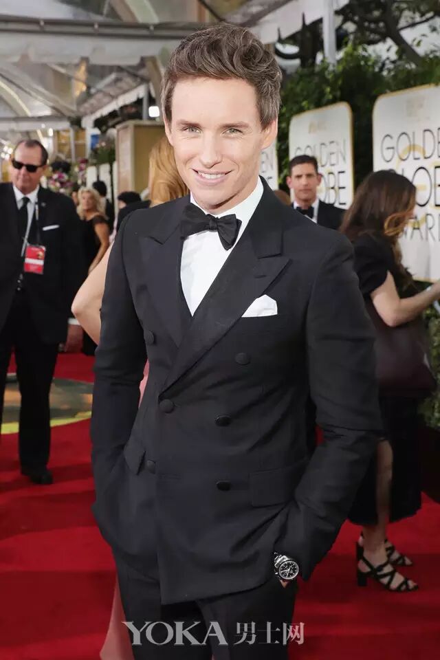 奥斯卡最佳男主角奖得主“小雀斑”埃迪•雷德梅尼 (Eddie Redmayne)出席金球奖,一向都是以好衣品著称的他身着经典黑色双排扣西装三件套,系黑色领结,佩戴欧米茄超霸系列专业“月球表”。经典黑白色,庄重又优雅,很适合红毯或者正式场合。