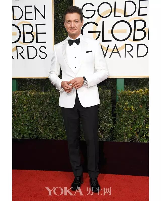鹰眼杰瑞米·雷纳(Jeremy Renner)虽然也是黑白LOOK,但选择了白色西装,就在众多一身黑男星中脱颖而出了,而且白色西装很显气质,可以在年会中尝试。给鹰眼加分的还有蒂芙尼Tiffany CT60系列腕表与蒂芙尼Paloma Picasso系列袖扣,儒雅绅士气质十足。