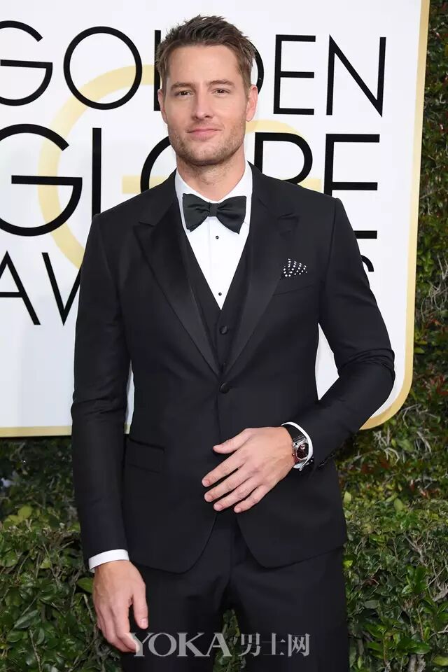 近日因为《我们这一天》(this is us)又火起来的贾斯汀·哈特雷也亮相金球奖,身高1米9的他选择了保守经典的黑色西装三件套,搭配波点口袋巾和BVLGARI宝格丽Octo系列陀飞轮腕表。有身材有颜值,只需要腕表和口袋巾点睛就够了。