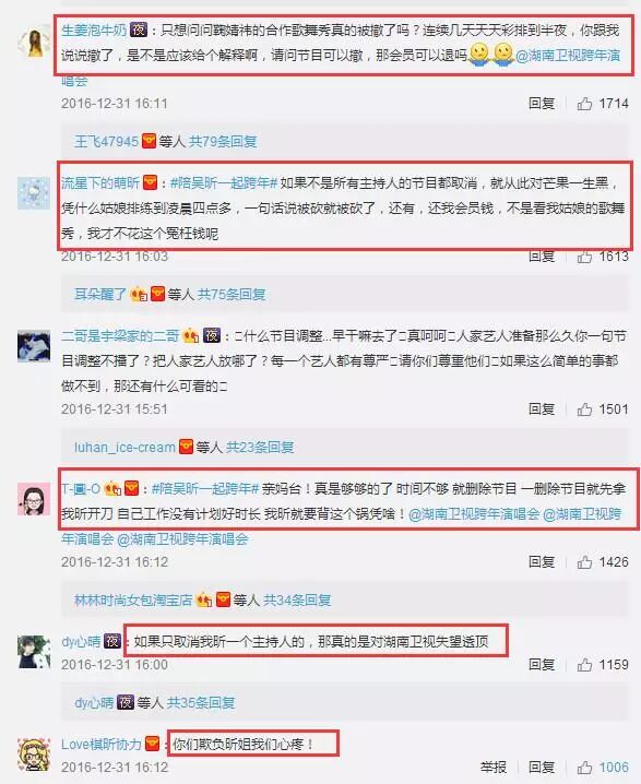节目被砍引起了广大网友的强烈不满,芒果台跨年演唱会官方微博沦陷,纷纷为吴昕抱不平,还有网友嚷嚷着要退钱。