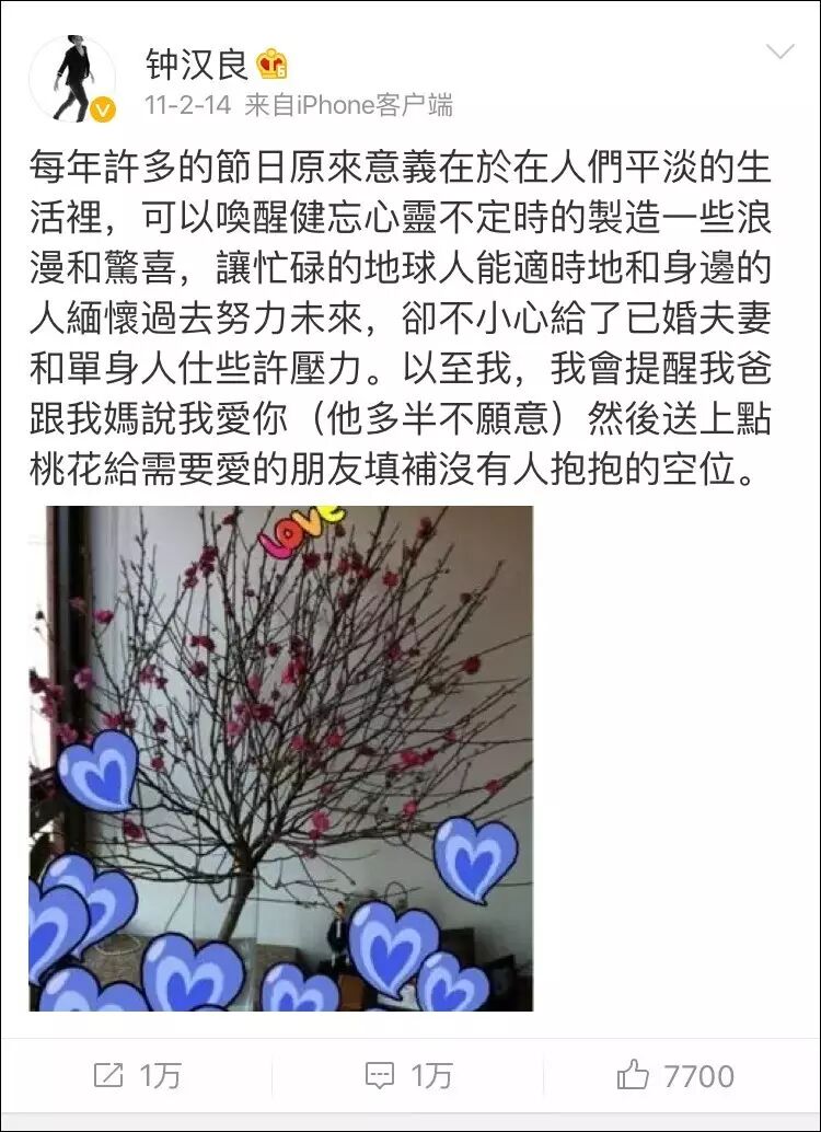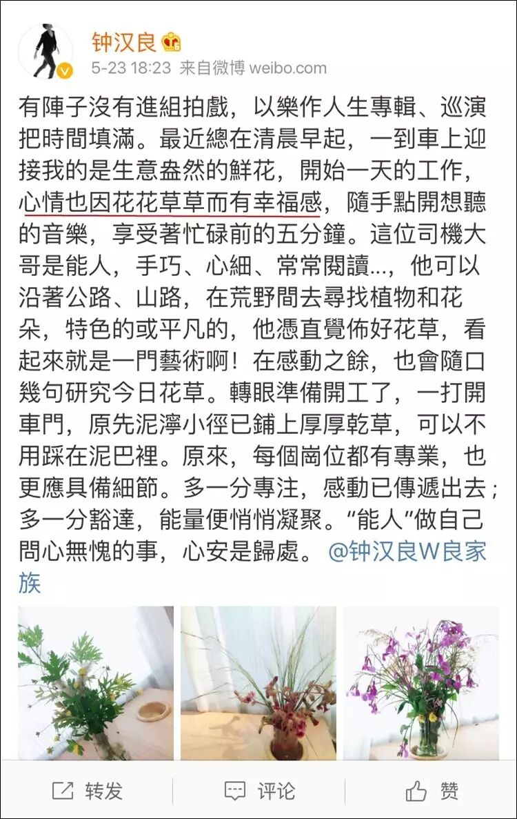 前两天,钟汉良更新微博,发了8束小野花和一张自拍,粉丝们感动哭了,还扬言说这种福利仅次于嫁给小哇本人!