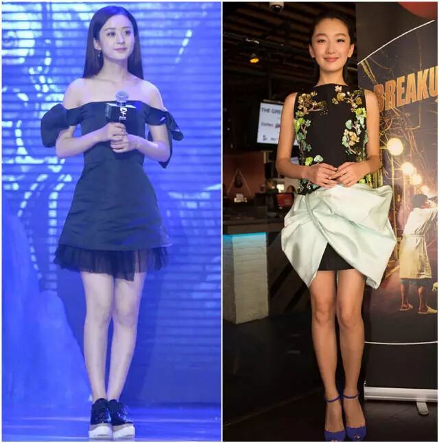 黑色裙装赵丽颖穿的可是比周冬雨穿的漂亮多了,小个子选择简单的纯色裙子,一字肩设计更加性感优雅,周冬雨的裙子很复杂,反而比较累赘。