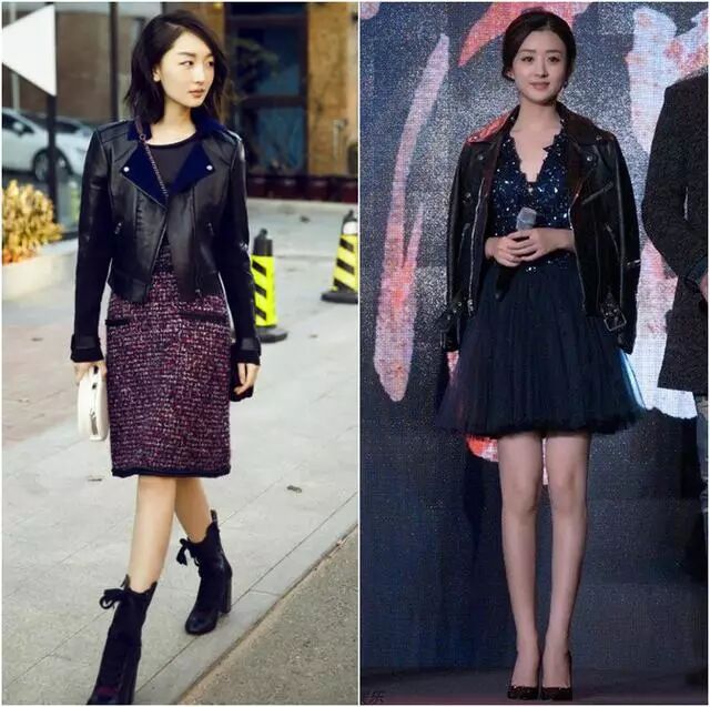 裙子搭小皮衣,周冬雨街拍穿的比较中规中矩,穿短靴更显腿短呢,赵丽颖穿小皮衣搭网衫礼裙,不及膝的长度非常适合她,脚踩黑色高跟鞋显得腿更加修长。