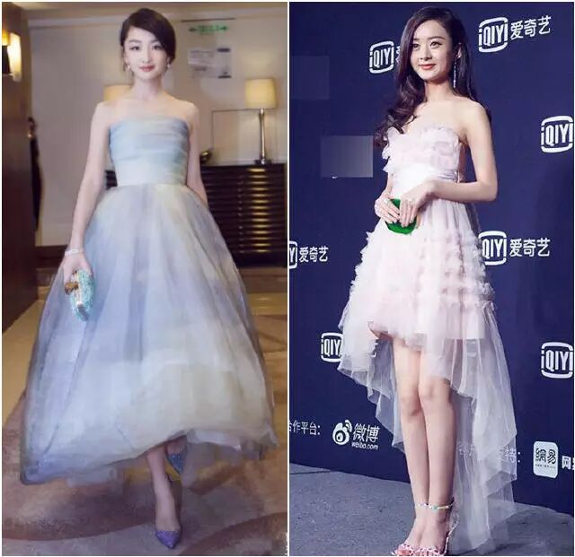 她们都穿过一次网纱裙,周冬雨穿抹胸的蓬蓬网衫裙,总感觉头轻脚重的,但是赵丽颖穿的就好看多了,粉色的网衫裙,前短后长的设计很显腿长,就像个小公主。