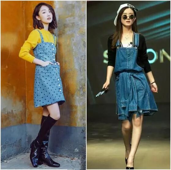 牛仔裙赵丽颖穿的可比周冬雨时髦多了,周冬雨穿黄毛衣搭牛仔波点背带,最丑的是这双靴子,腿短的姑娘一定不要尝试啊。赵丽颖穿背带裙搭黑色针织衫,时髦极了。