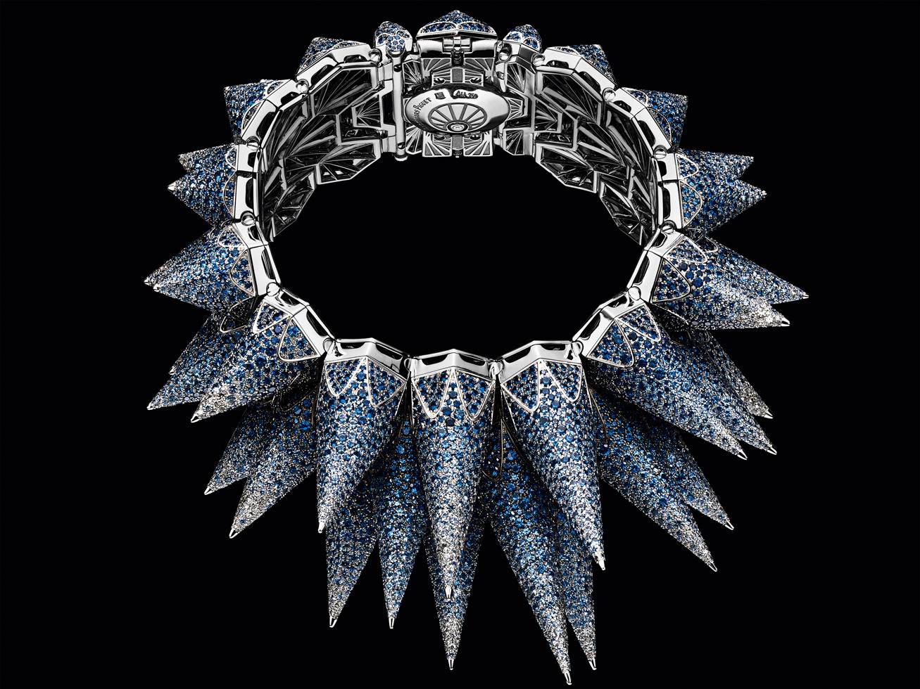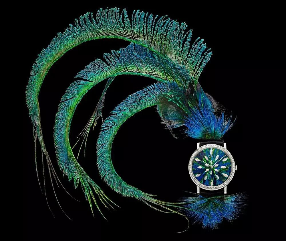 表壳直径38毫米,18K白金材质,镶嵌78颗圆形切割美钻(约0.71克拉)。这款表最大的特色是用鸭、孔雀、公鸡羽毛细工镶嵌的表盘,部分构图由银质叶片覆盖。再配上绢质感蓝色小牛皮表带,你还没有心动吗?不过限量只有38枚哦。