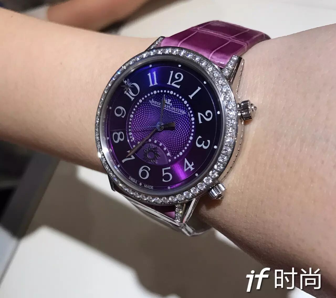 约会系列自推出后一直是积家的热销产品,今年的新款加入响闹功能,可以提醒约会时间即将来临。图中表款为约会系列妙音响时腕表,表壳38.2mm,表圈及表耳都镶嵌钻石,紫色的表盘哪个女孩不喜欢呢~