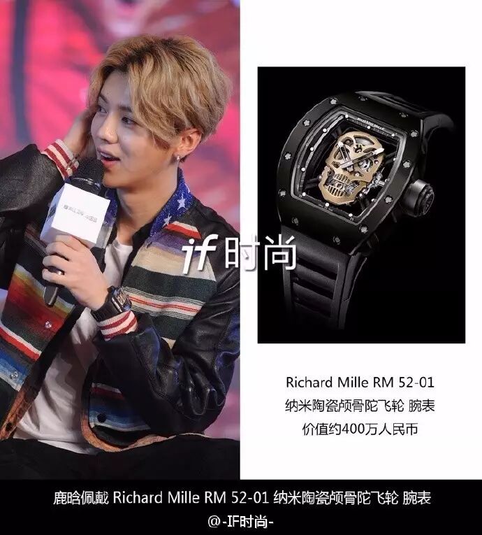 鹿晗是里查德米尔(Richard Mille)的死忠粉,至少有5支该品牌的腕表。他戴过一款限量100支的PM52-01 骷髅腕表,舍得花掉400多万把它抱回家,一块表抵得上一栋别墅,足见是真爱。