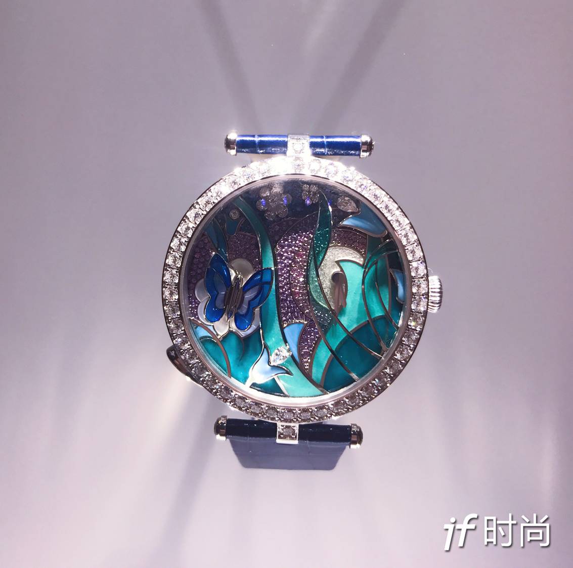 一只会飞的蝴蝶藏在了表里!表盘用珐琅、钻石和蓝宝石构成花丛,而蝴蝶会自动张合翅膀。腕表静止时,它随机飞舞;当腕表被佩戴之后时,蝴蝶随着主人的动作改变起舞的次数。这款表非常符合梵克雅宝“诗意制表”的哲学。