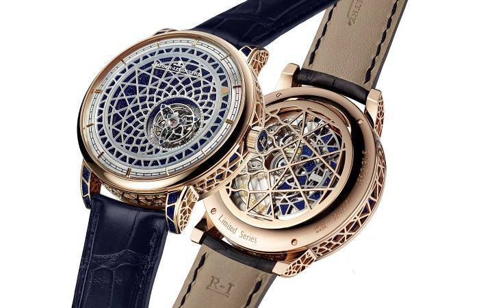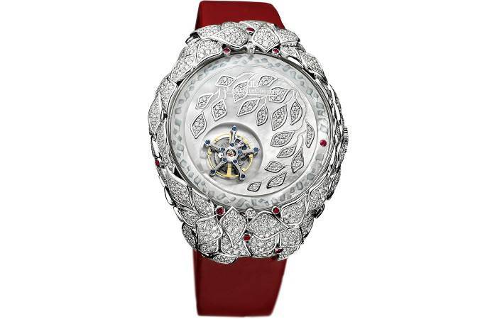 女款的表壳上镶嵌着73片常春藤叶子,一名工人要耗费6个月的时间才能完成。这款表同样是陀飞轮代替时针,分钟则由红宝石代替。限量3块,分别是红色、蓝色、白色,每一块表都是全世界独一无二滴。