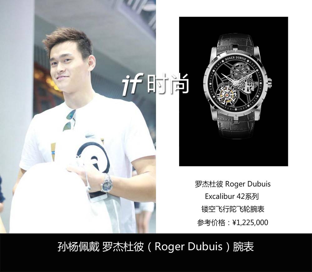 曾经戴着iWatch闯天下的“泳坛一哥”孙杨,里约奥运会后被发现戴了一款120多万的罗杰杜彼(Roger Dubuis)Excalibur 42 Skeleton Flying Tourbillon镂空陀飞轮腕表,好一个高富帅大白杨。